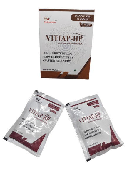 VITIAP-HP is a specialized nutritional supplement formulated to support muscle recovery and overall health. Its key components include soy protein isolate and whey protein concentrate, which together provide a high protein content of 63.5 grams per 100 grams. This blend is enriched with essential vitamins, minerals, and amino acids, crucial elements for the body's well-being.